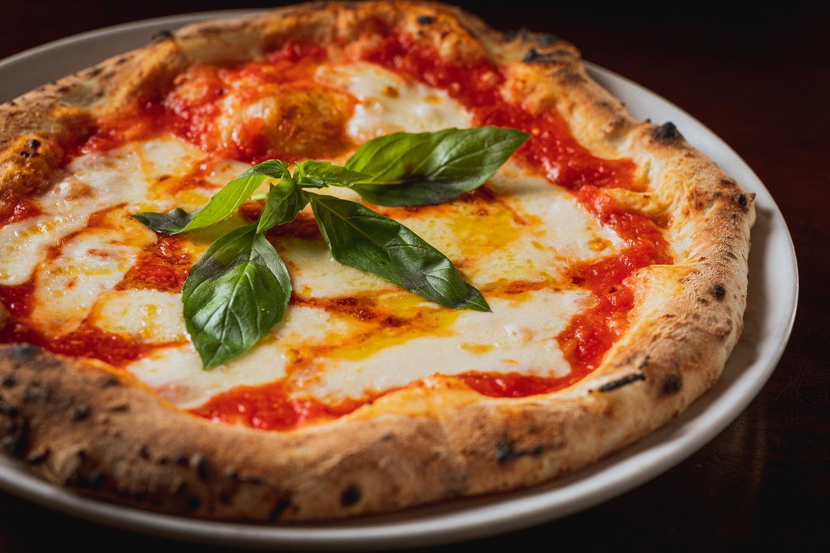 イタリア産トマト、モッツァレラチーズを使用の本格ナポリピッツァ。石窯焼きで高温で一気に焼き上げることで外はカリッと中はもちっと焼き上がります。