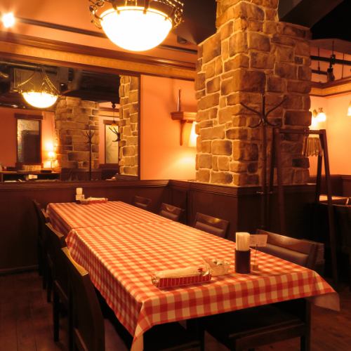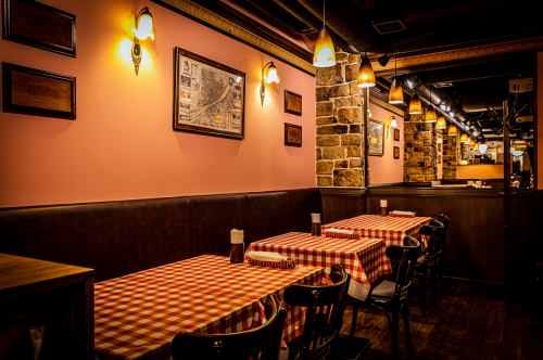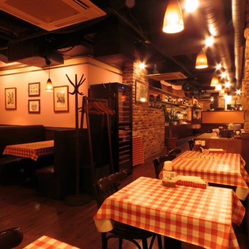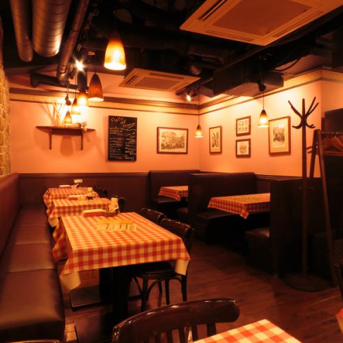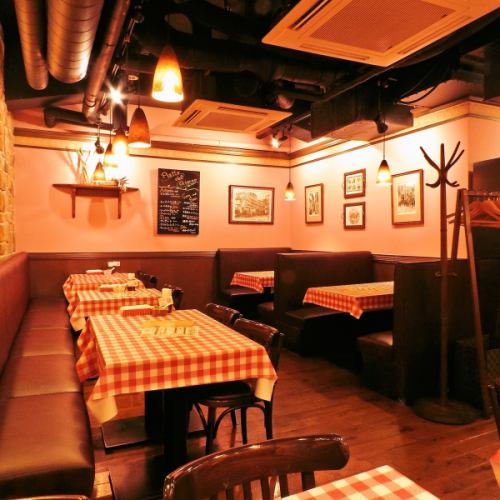 ピンク色の壁と暖色の照明に照らされたギンガムチェックのテーブルクロスが映えるおしゃれな店内。壁に飾られたアンティーク絵画と深い色味のインテリアが、可愛らしい印象だけでなく落ち着いた雰囲気も演出します。店内は広々としており、大人数でのご利用や貸切でのご利用も可能となっておりますので、お気軽にご相談ください◎